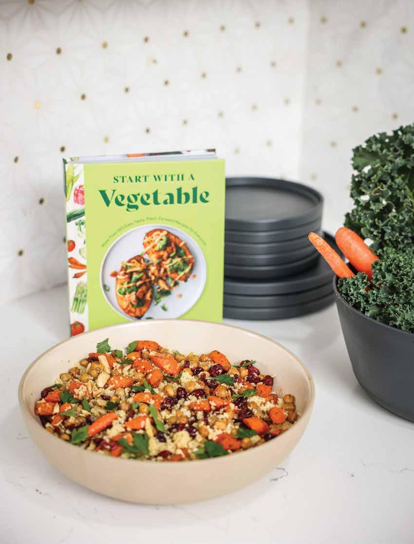 Step 9. In the same mixing bowl used to season the veggies, whisk together the lemon juice, 2 tablespoons of olive oil, and the cranberries.