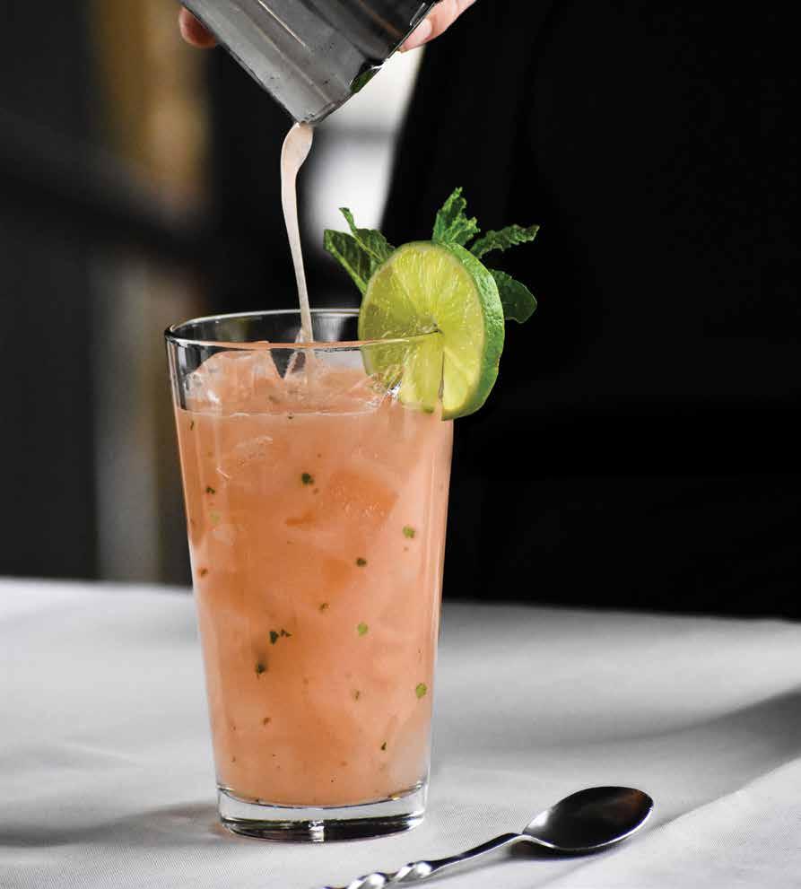 • Muddle mint, lime juice, and rhubarb puree in a glass or small cocktail shaker