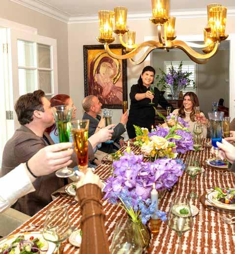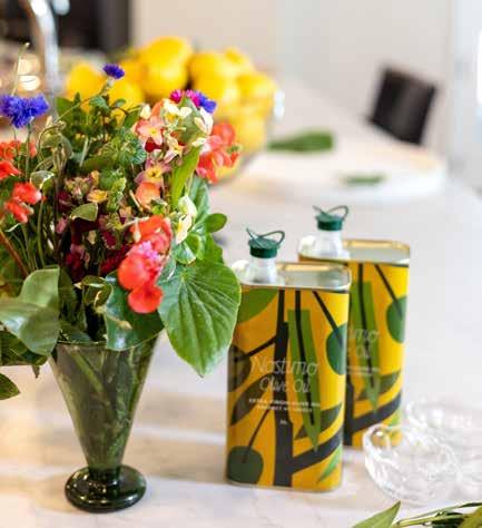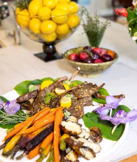 specific linens and creates scapes on her tables in clients’ kitchens while prepping — grape trees, herb bouquets, seasonal fruit displays — that make every buffet feel like art. She brings her own iconography collection from Greece, her own premium Nostimo Extra Virgin Olive Oil (which she now produces and sells at Lori Karbal in Birmingham and area Market Square stores), she manages the florals — she brings an attention to detail that transforms a meal into an experience.