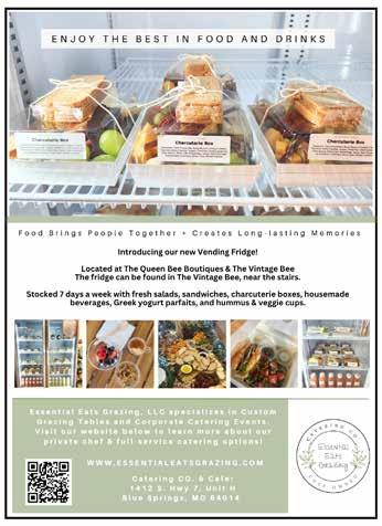 Looking for a fresh, healthy lunch or snack in Blue Springs? Essential Eats Grazing LLC has introduced a new vending fridge at The Queen Bee Boutiques & The Vintage Bee. Grab chef-prepared favorites like charcuterie boxes, signature sandwiches, yogurt parfaits, hummus cups, fruit cups, and more. The fridge is located downstairs in The Vintage Bee near the stairs. Open daily: Monday–Friday 10 AM–8 PM, Saturday 10 AM–6 PM, and Sunday 12 PM–4 PM.