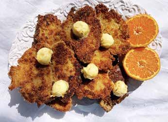 • Once all the croissants are fried, place immediately on a serving tray, top with dollops of orange butter, lather with warm maple syrup, and prepare for the perfect bite!