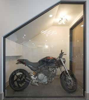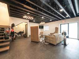 The garage includes a 1200-square-foot apartment, complete with a lobby, bar, living room, two bathrooms, and a bedroom for those nights when you just don’t want to leave. “We’ll have Formula 1 watch parties here with friends. We’ll do happy hours,” he explains. They’ll even host pickleball tournaments when there’s enough room inside. “Yeah, we built it to share.”