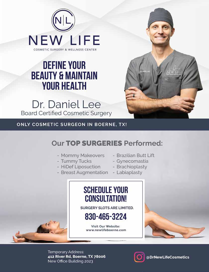 Give Your Face a triLift! No Injections, No Surgery Address sagging jowls • Tighten your jaw line • Enjoy a youthful, lifted look Tone your cheeks • No pain, no downtime • Nonsurgical Dynamic Muscle Stimulation The new aesthetic treatment utilizing Dynamic Muscle Stimulation Courtesy of Travis J. Laverne, PA-C Before After 5 treatments La Vraie Beauté Boerne 609 South Main Street , Boerne, TX 78006 210-687-1110 La Vraie Beauté Alamo Heights 7979 Broadway, Suite 101 San Antonio, TX 78209 210-688-4106 www.lvbsa.com Here’s the deal, save more than before. Combine home and auto and get even better savings with new, lower home and auto rates. I’m ready to help you start saving today. Call me for a quote. Like a good neighbor, State Farm is there.® Ruben Cardenas Jr ChFC CASL RICP, Agent 410 E. San Antonio Avenue Boerne, TX 78006 Bus: 830-249-3325 | ruben.cardenas.cpbe@statefarm.com State Farm Mutual Automobile Insurance Company Bloomington, IL State Farm County Mutual Insurance Company of Texas Richardson, TX 2001173TX 59 | CITYLIFESTYLE.COM/BOERNE JULY 2023