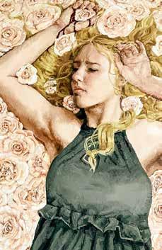 “A Bed of Thorns Where Roses Lie” depicts Brayden laying in a bed of white roses. Her eyes are closed and her arms are raised, with one hand pierced by a flower’s barb. “It's about society’s standard of beauty,” she says. She and some of her