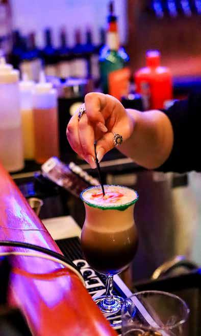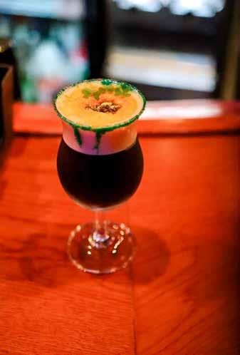 3. Garnish with a green sugar rim, orange-tinted foam, and gold glitter coffee beans.