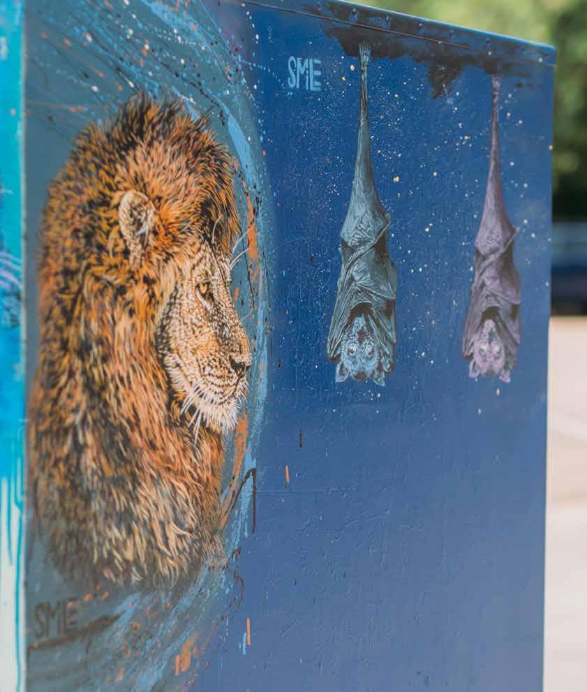 SMiLE’s work is spread out across the city (and around the world—a fox in Paris, a kitty in New York City). The locations around Boulder vary, selected both for their significance to the artist, but also for their suitability thematically and technically as a medium.