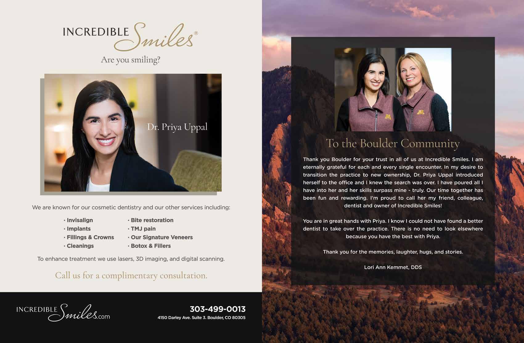 Learn how to start your own publication at: citylifestyle.com/franchise CITYLIFESTYLE.COM/BOULDER | Boulder Lifestyle™ is published monthly by Lifestyle Publications LLC. It is distributed via the US Postal Service to some of the Boulder area’s most affluent neighborhoods. Articles and advertisements do not necessarily reflect Lifestyle Publications’ opinions. No portion of this magazine may be reproduced in any form without written consent. Lifestyle Publications does not assume responsibility for statements made by advertisers or editorial contributors. Information in Boulder Lifestyle™ is gathered from sources considered to be reliable, but the accuracy of all information cannot be guaranteed. 20