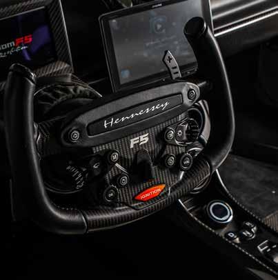 F5 in August of 2014, rocketing Hennessey into the hypercar market. Its 6.6L twin turbo V8 produces a mind-boggling 1,817 Horsepower that pushes the car's top speed to a theoretical 300+ MPH (achieving top speed is more difficult than you’d think). To put that power into perspective, a brand new Toyota RAV4 produces 203 HP- the Venom F5 weighs significantly less than the SUV and delivers nearly 9 times the power. The Venom F5 has a power-to-weight ratio of 1,298 horsepower per ton, which is the best of any car currently on sale. Cars that look like the Venom F5 make a sound that is predictable- high-pitched, frantic revs that zing more than a punch. The monster twin turbo V8 produces a fury that sounds more like a dragster than a slick European supercar-and that’s all part of the appeal. Think cowboy boots rather than Oxfords and a dinner jacket. The build quality of the car is exceptional. Once you lift the vertical doors and settle into the car, you notice that it’s tiny, as all these cars tend to feel but also very well put together. The interior reminds me a lot of the latest Ford GT. Carbon Fiber everything, machine milled aluminum control knobs, yolk steering wheel with shift paddles attached that have the most satisfying paddle shift ‘click, click’ I’ve ever come across. To sum it up, the fit and finish of this hypercar is outstanding.