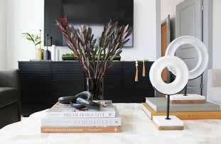 Instead of jumping right into an extremely contemporary style, Patricia knew she needed to ease her client into it. “In the living room, a modern petrified stone coffee table gives a lot of really nice texture, and it's got creams and golds, which are the tones that my client is drawn to. We've got a little bit of leather in there too and some traditional Schumacher fabric prints that just give that nod back to a traditional style,” she says.