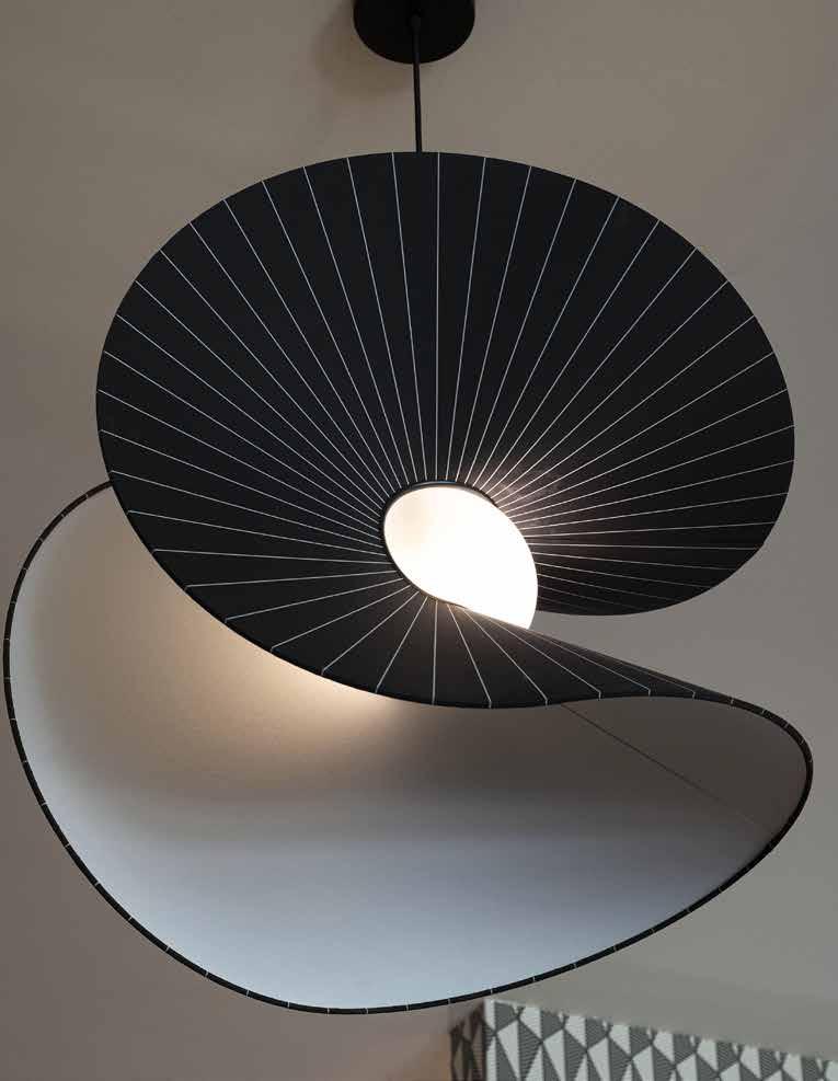 Suspension in striped cotton, black and white, on PVC. Diffuser in blown borosilicate glass with a sanded finish.