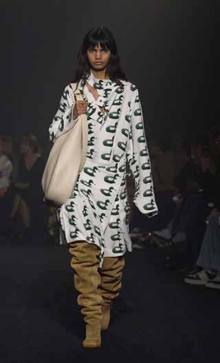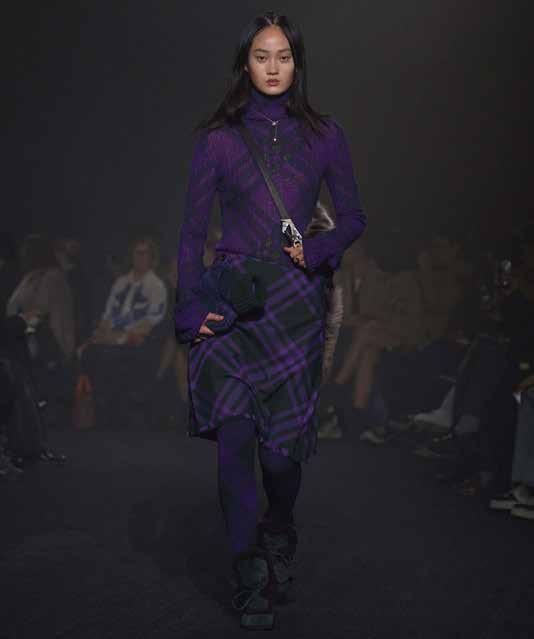 | BURBERRYBurberry ushers in a new era with Daniel Lee at the helm as chief creative officer. His debut collection reimagines their signature check with new proportions and bold color pairings. Moody outfits in aubergine and olive serve low-key glamor. The check isn’t the only pattern on offer this season. Dare to go all-in with a head-to-toe mallard-print look in contrasting colorways.