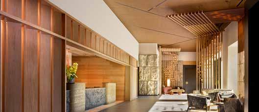 There is a restful peace and sense of welcome that you feel as you cross the threshold into the austere lobby, seemingly surrendering itself to each guest. Lush teak paneling and a massive raw rock walk soften as light floods the lobby, illuminating the reception desk and conversational