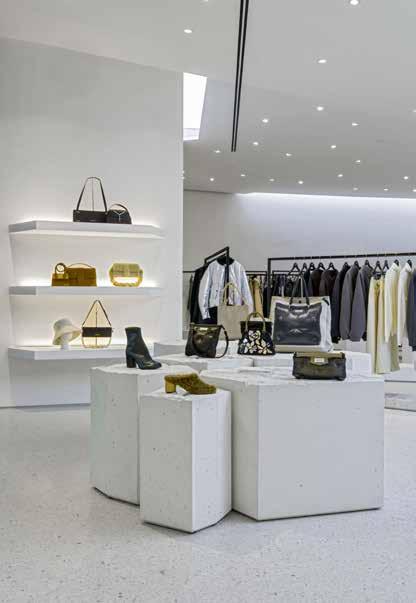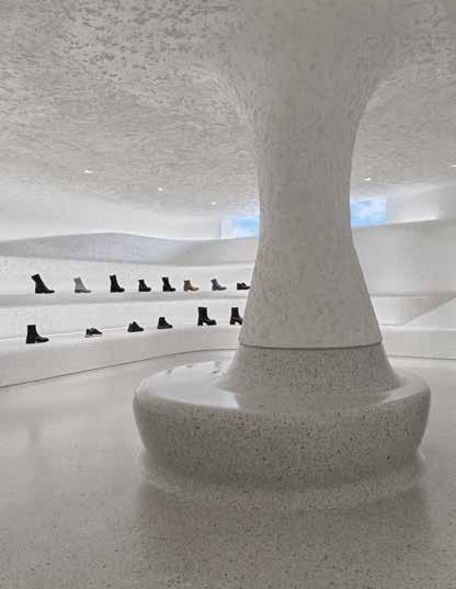 red brick. Inside, hand-poured terrazzo floors and hand-applied plaster walls provide juxtaposition between the interior and the clothing, creating a distinctive space for visitors to explore.