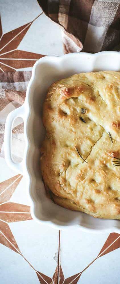 Preheat the oven to 425°F. Drizzle the remaining 2 tablespoons of olive oil over the dough. Rub your hands with olive oil and use your fingers to make indentions on the surface of the dough. Sprinkle it with salt and rosemary and any desired toppings. Bake for 20-30 minutes or until golden brown.
