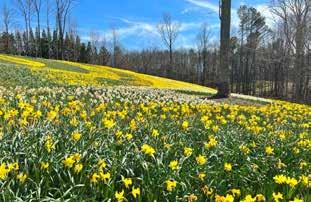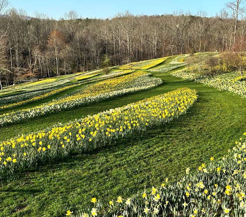 The grand finale to the spring walking tour at Gibbs Gardens is the daffodils. This sprawling hillside garden cascades into the valley between the Manor House and the North Georgia Mountains. The sweeping meadows display 20 million swaying daffodils that seem to be waving to the more than 4,000 garden guests meandering through the natural walkways on any given Saturday. This 50-acre masterpiece is a tribute to Jim’s mother, whose deep devotion to nature inspired her son to create one of the most extensive public gardens in the United States.