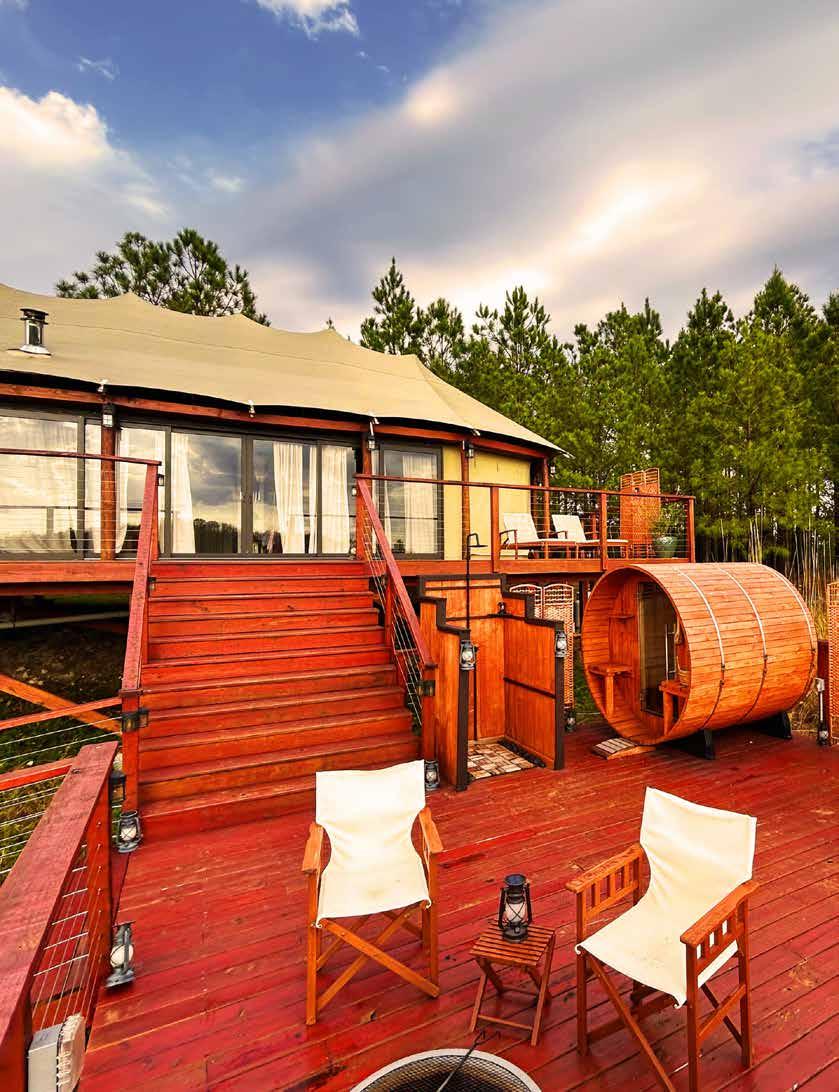 Breathe...one can feel the stress melting away as you arrive at your destination of rest and relaxation. Each luxury tent includes your own private three hundred sixty degree view of the mountains and valleys. Not to mention the sunsets and sunrises to revel while sipping your favorite beverage or enjoying the quiet of just being still. True relaxation would not be complete without your own private wooden sauna and jacuzzi. The outdoor amenities almost surpass the indoor glamping life…I said almost. Picture yourself in the movie “Out of Africa,” and upgrade yourself to a fivestar tent experience that rivals most resorts.
