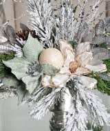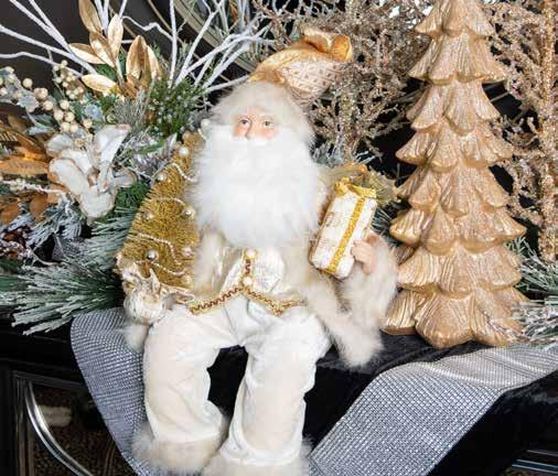 Josette’s approach to Christmas decor is all about individual style and creativity. Each design reflects her passion for the season and dedication to bringing a modern twist to traditional holiday elements. For her home, she has adorned her fireplace mantle in all white, showcasing elegant nutcrackers in white and gold, complemented by cone trees and frosted evergreen picks. The mantle is further enhanced by lit garland finials and boughs that gracefully drape down. A round mirror is adorned with a white wreath and sparkling crystal accents. Topping it all off is a gorgeous gold starburst, adding a touch of glamour.