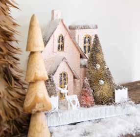 Our Petite Pink House retailing at $39.99 is one of the smaller homes in the holiday house collection, making it an easy piece to add to a shelf, mantle or even a table. Its muted color palette makes it a perfect accompaniment to natural elements, such as our wooden and feather trees. Can be illuminated.
