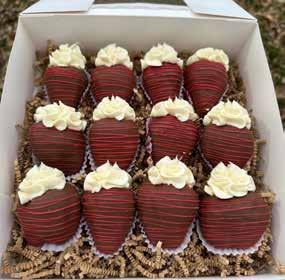 Dipped in a choice of chocolate with a choice of colors. The strawberries have the middles removed and filled with a homemade cheesecake filling. Half dozen $18 Full dozen $35
