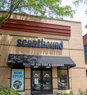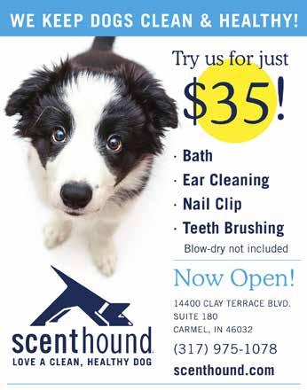 In sprawling Central Park, northeast of the trails, playground, community center, and The Waterpark, you’ll find the Central Dog Park. This three-acre park has designated areas for small and large dogs with plenty of space to run and play. Central Dog Park is membership-based and accepts new registrations twice per year. Follow Carmel Clay Parks & Recreation on social media for the next opportunity to register, coming this fall. Check out carmelclayparks.com for more places to take your furry friend yearround. And If your dog gets dirty exploring all Carmel has to offer, don't worry. Scenthound's doors are wide open.