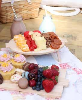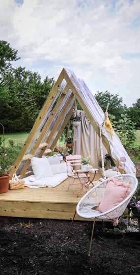 For the A frame you need a 60-degree angle at the top of the A, and a 30-degree angle at the bottom. You can run a 4 x 4 along the decking to attach the A frame which adds a bit of height so adults can stand in it as well. Use heavy duty exterior screws to attach the A frame 2 x 4’s to the structure. The top of the A comes together and is held by exterior screws. For the roofing, we used 8-foot corrugated clear panels and screwed those into the A frame for a weather protecting cover. We left three feet uncovered so a chair and some pots with herbs and flowers could be added to the entrance. Decorate with outdoor pillows, a children’s table, outdoor rug and hanging flower pots to make it feel like a special place for kids to go. If entertaining friends, a few simple charcuterie boards are always a hit.