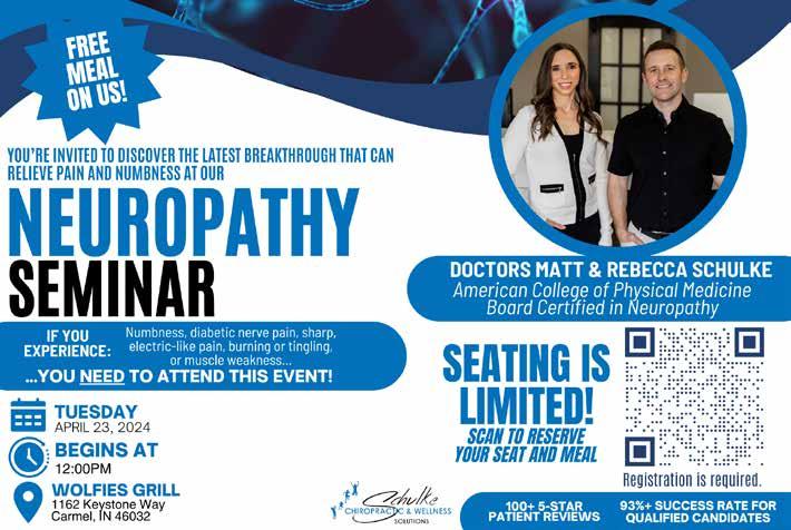 Schulke Chiropractic & Wellness Solutions offers free peripheral neuropathy seminars. Registration is required for the next seminar, which will include free lunch, at noon on April 23 at Wolfies Grill at 1162 Keystone Way in Carmel.