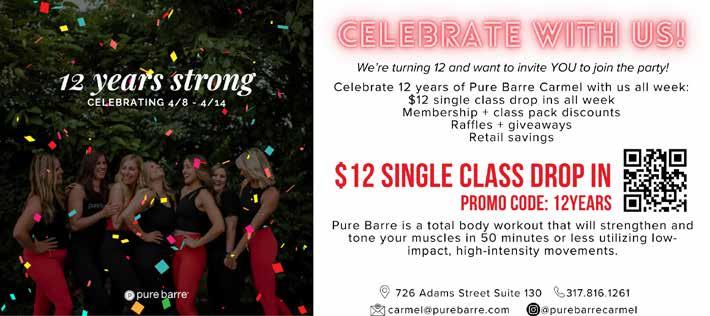 Pure Barre, at 726 Adams St. in Carmel, is offering $12 drop-in classes April 8 through 14 for new and returning clients. Raffle tickets can be earned all week, plus enjoy a Wine Down Wednesday sip and shop, Abby’s Garden Parties at 11:30 a.m. Saturday and more. In addition, the studio will be offering a 10-class package for $240 and 24% off the first month for new memberships.
