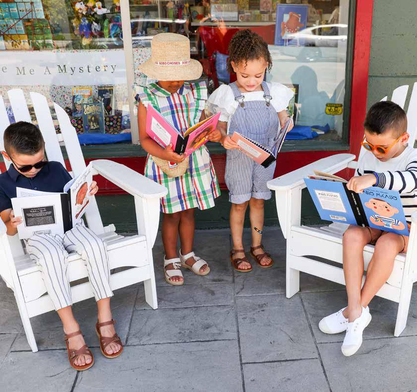 From left, Noah wears a Mayoral navy knit polo with striped pants; Nora looks adorable in a Bobo Choses plaid dress, straw hat and purse; Moira models a Mayoral white eyelet top with Dotty Dungarees striped overalls; and Liam has on a Mayoral navy striped sweater with Miles the Label rust linen shorts. The kids' books come from the Little People, Big Dreams series.