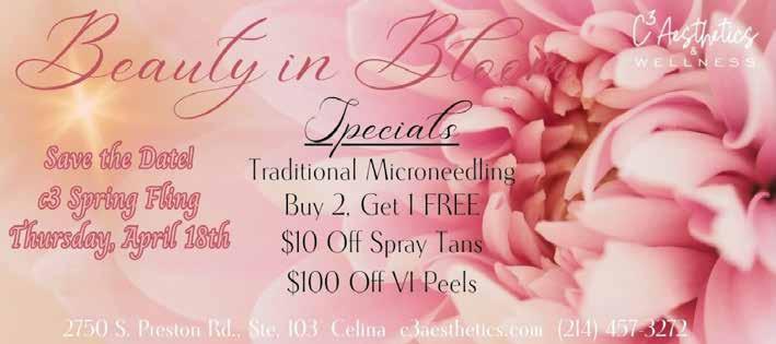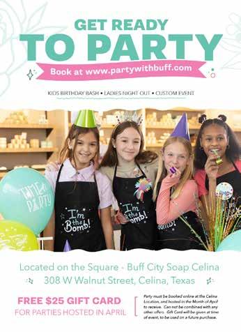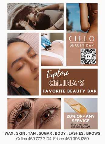 Fri eat • drink • plant • putt 212 N Oklahoma Dr • Celina TX 469.573.1936 View our events on our website littlewoodenpenguin.com Schedule your event with us: info@littlewoodenpenguin.com Wed - Thurs | | | Sat Sunday 4pm - 10pm 2pm - 10pm 11am - 11pm 12pm - 8pm shop • learn • experience 972-382-8520 PrestonFamilyHealthcare.com 1050 South Preston Rd., Ste. 119, Celina Let Us Help You Start this Spring on a Healthy Lifestyle Weight Management Sports Physicals Tele-Visit Appointments Wellness Annual Visits Now accepting new patients, Joshua Servin, DNP, APRN, FNP-BC Our Family CARING FOR YOURS Welcome to our team, Josh! 73 APRIL 2024 | CITYLIFESTYLE.COM/CELINA