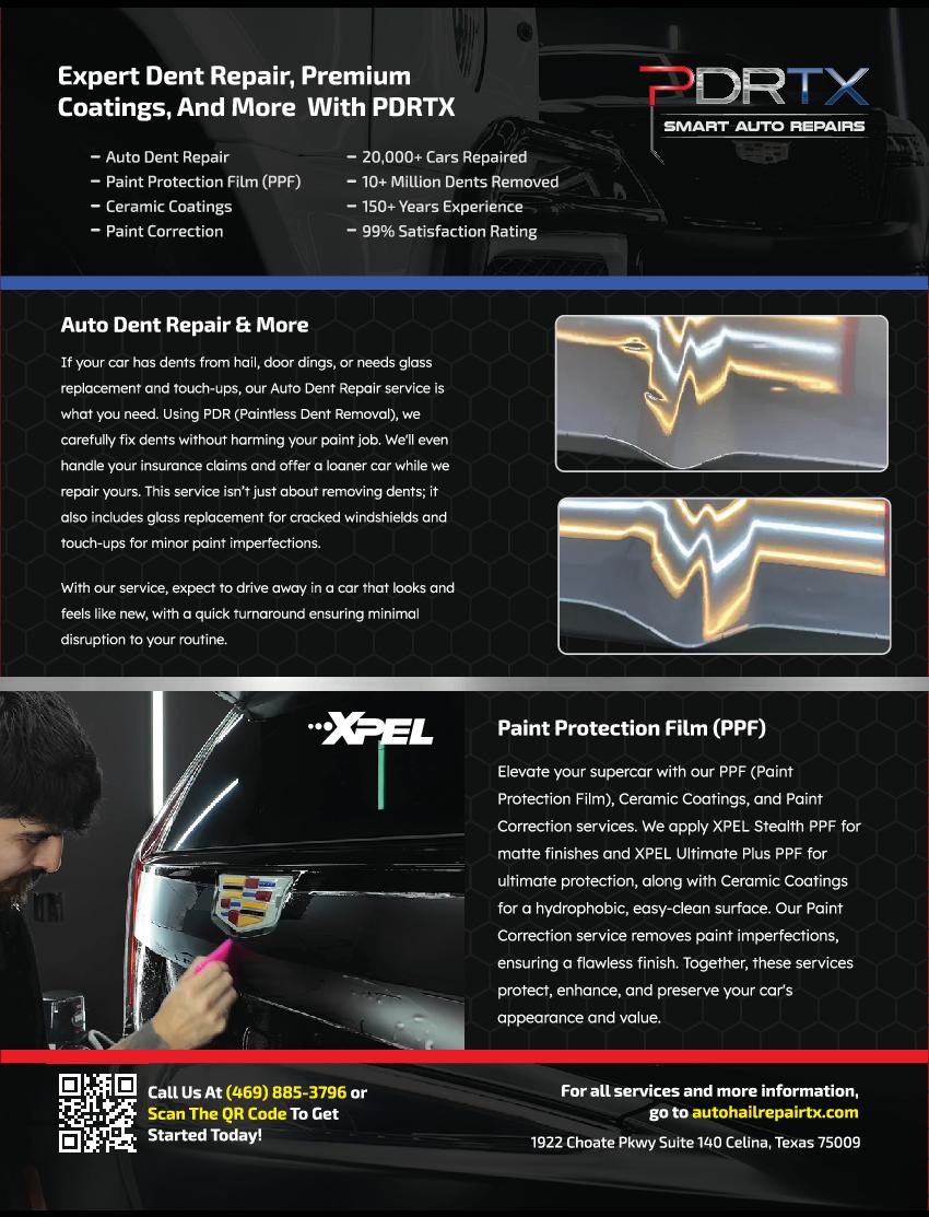 Please welcome new partner, PDRTX Smart Auto Repairs! PDRTX (1922 Choate Pkwy, Celina, TX) offers services for auto hail repair, paint-less dent repair, auto glass replacement and chip and scratch repair. Now offering new repair services for automotive, marine and coach/RV including Xpel Paint Protection Film, Xpel Stealth Satin Finish, paint corrections and ceramic coatings. White Glove service and courtesy loaners available including deductible savings. Learn more at 469-885-3796 or AutoHailRepairTX.com
