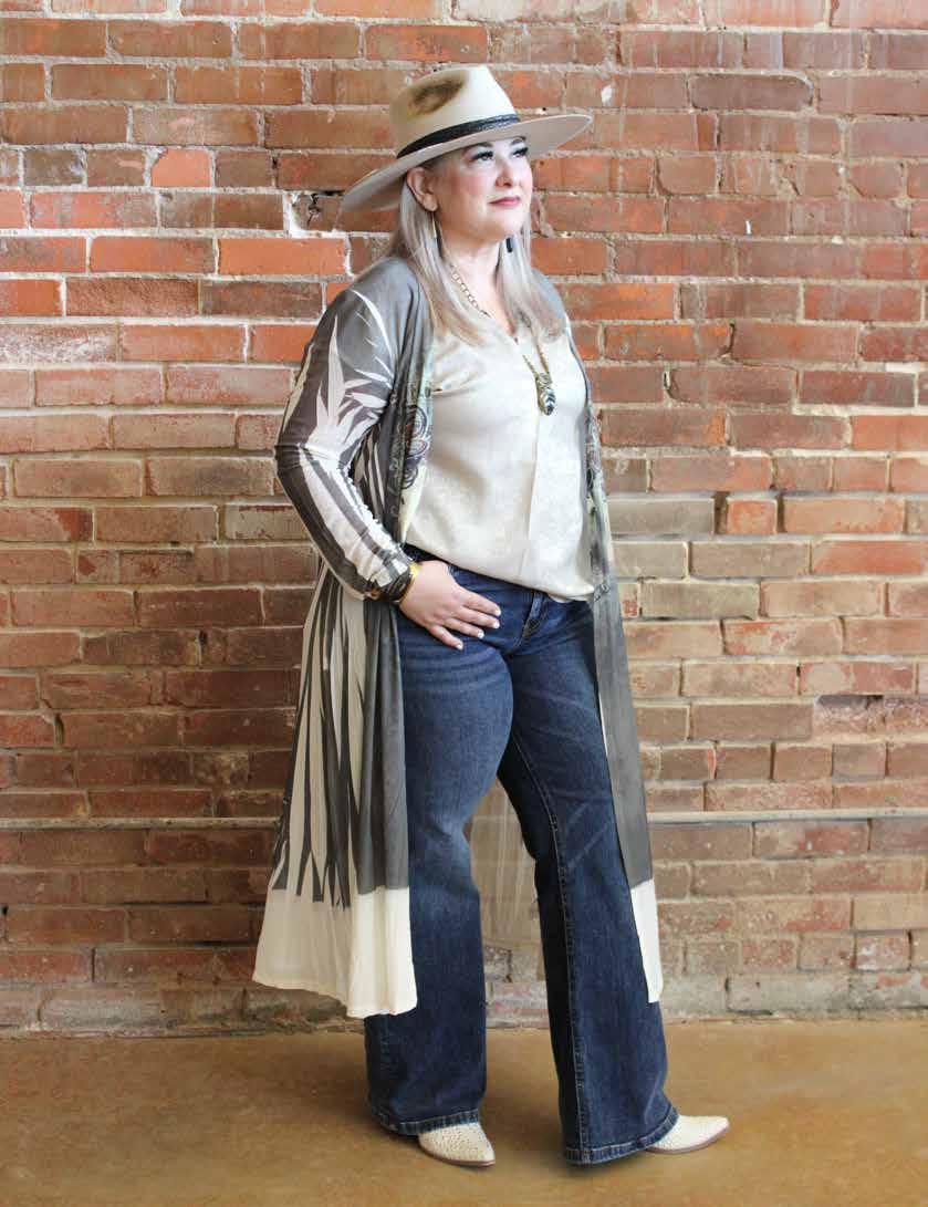 Kim is wearing an Origami duster, Jodifl top, Kut from the Kloth jeans, Corky’s boots from Annie Jack with a Caimey Hat.
