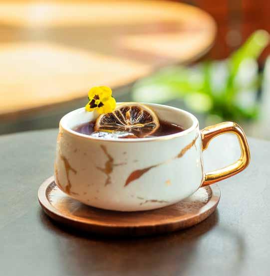 • Garnish: Fresh lemon wheel with violet flower