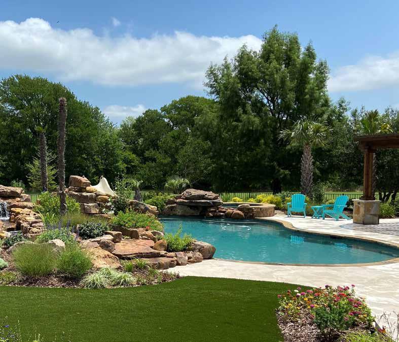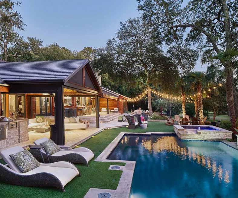 Heather Weisz of Weisz Selection in Gunter has some suggestions. Gone are the “kidney bean” shaped pools replaced by ones that are sleek and linear. “Spools” (large spa-small pool combos) provide a solution for smaller backyards, while larger spaces now incorporate lazy rivers, splash pads, or islands with sunken bars. Water and fire features, color changing LED lights, covered patio structures, outdoor kitchens, plus fireplaces are popular.