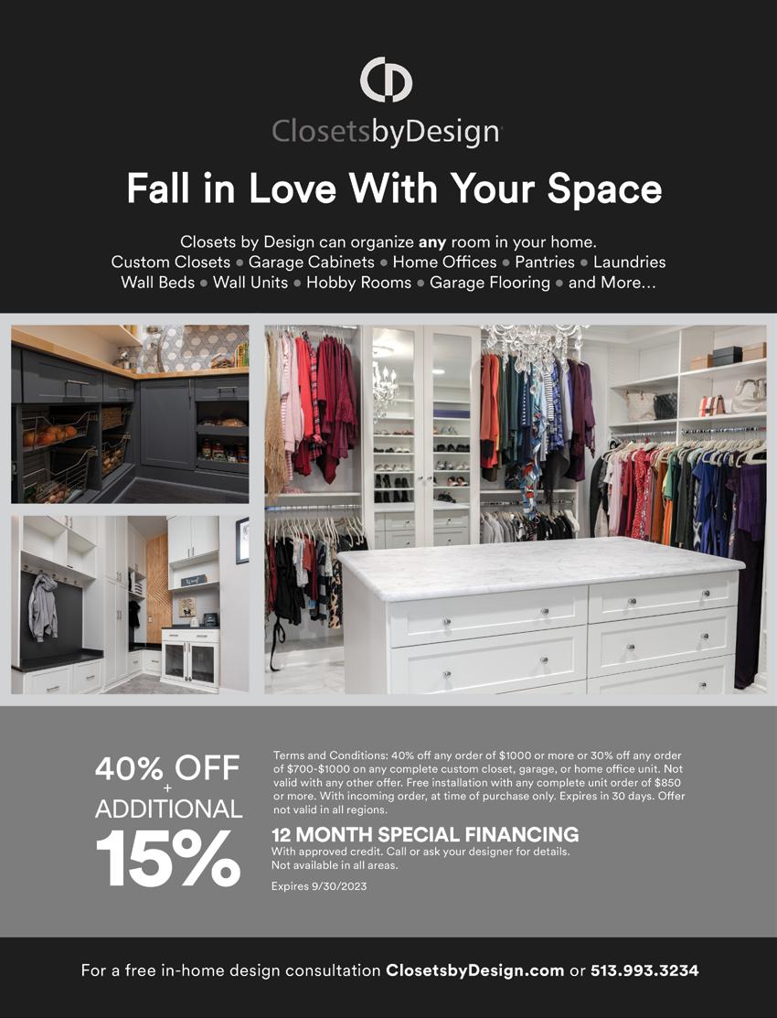 At the event get inspired in the beautiful DDC showroom, and receive 10% off your services if you book a consultation while there. DaytonDesignerClosets. com/Fall-Event