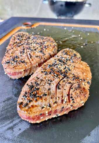 7. Put the tuna steaks on the griddle once the surface is 500550°F and sear for 1 minute per side. You can push to 1 minute 30 seconds, but this tuna is sushi-grade and safe to eat raw.