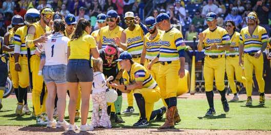 “At the end of the day, it’s still a baseball stadium,” Jared says, talking about the team taking on the world tour in stadiums around the globe. “It’s still bases and a pitcher’s mound and a home plate.” But he also adds, there’s a guy walking on stilts, and there’s a rodeo clown, and there’s maybe some fire. “But hey, we’re just a bunch of normal people who are putting on a fun baseball game for everybody,” he says. “We’ve built some great relationships and we’ve been fortunate to play in some really beautiful stadiums across the country…It’s just crazy to think that here we are from Savannah, and we’re playing in Des Moines, Iowa.” The 2024 world tour has also taken the team to places like Boston, Cleveland, and Albuquerque, New Mexico, just to name a few.