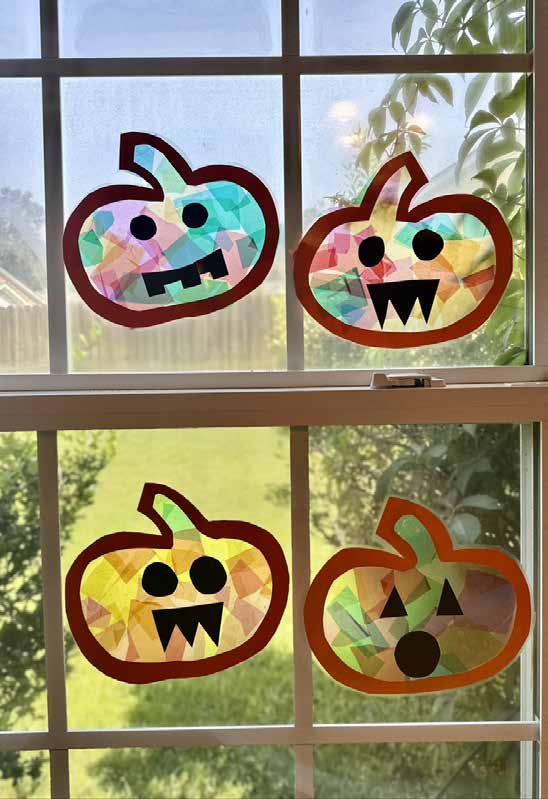 Start by drawing a pumpkin outline on your paper and cutting it out. Draw and cut shapes for the pumpkin’s face too. Using cellophane or tissue paper, cut 2–4-inch squares and other shapes to fill your sun catcher.