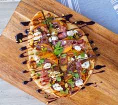 Brush olive oil onto both sides of naan flatbread, and place in oven on rack for 10 minutes at 400 degrees, or grill for 2 minutes each side. Grill peach slices for 2 minutes each side, or place in oiled sauté pan till each side begins to caramelize. On a cutting board, lay flatbread down, and place grilled peach slices around flatbread. Take small pieces of Paneer cheese and place throughout over the peaches. Be creative and find place for the soppressata or salami of your choice. Garnish with crushed pistachios and torn fresh mint. Cut flatbread, transfer to serving plates, and drizzle with balsamic reduction.