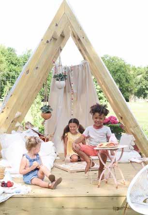 For the A frame you need a 60-degree angle at the top of the A, and a 30-degree angle at the bottom. You can run a 4 x 4 along the decking to attach the A frame to which adds a bit of height so adults can stand in it as well. Use heavy duty exterior screws to attach the A frame 2 x 4’s to the structure. The top of the A comes together and is held by exterior screws. For the roofing, we used 8-foot corrugated clear panels and screwed those into the A frame for a weather protecting cover. We left three feet uncovered so a chair and some pots with herbs and flowers could be added to the entrance. Decorate with outdoor pillows, a children’s table, outdoor rug and hanging flower pots to make it feel like a special place for kids to go. If entertaining friends, a few simple charcuterie boards are always a hit.
