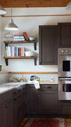 The homeowners were able to combine textile inspiration from all over the world to create this cozy and eclectic space. Warm red kilim and Persian rugs ground the space and add warmth and texture while the traditional patterns impart a sense of familiarity and timelessness. Indigo-dyed throw pillows add a bohemian flair inspired by African mud clothes and indigo dying techniques of Japan. Indigo has been everywhere lately—maybe because the textiles remind us all of our favorite pair of selvedge denim and a soft white T-shirt. The leather knobs on the kitchen cabinets latch perfectly onto the wooden kitchen shelves to complete the natural look of this home.
