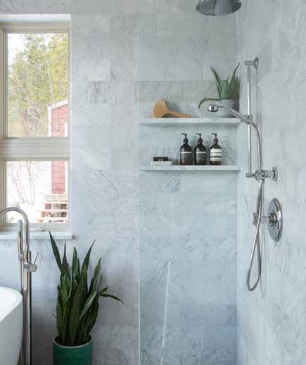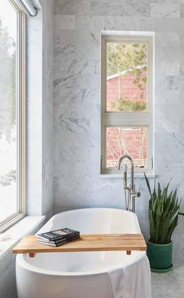 Now to the bathroom. Not only is there a beautiful open view of the trees with solitary peace, but the room is also decked head-to-toe with grayscale marble. If you are afraid to get your feet wet with an all-marble bathroom, maybe cold feet is a concern? Don’t worry—a vintage rug does the trick. Overall, this beautiful space is a real-life Pinterest board that has us inspired to renovate and refine.