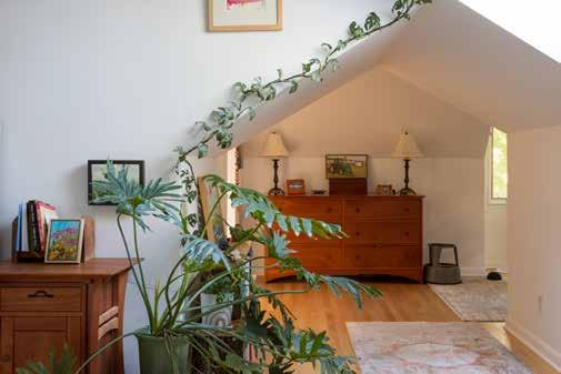 In the warmer seasons, it’s easy to settle in on the house’s back patio. After strolling past the black cohosh and cardinal flowers planted along the side of the house, Greenewalt can settle in under the shade of the large red maple in her serene backyard. Filled with meadow rue and hydrangeas, the planting of which was guided by Michelle Smith of Fine Gardening and Consultation, the backyard is a peaceful retreat. The historic cast iron panels once