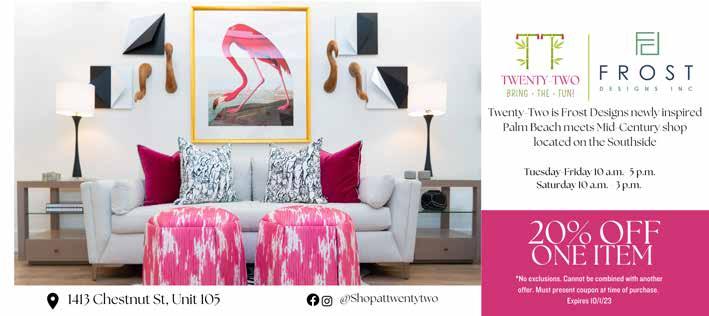 LEARN MORE: With a degree in interior design from UTC, Lindsey Frost’s lifetime dream to open a retail storefront came true with the inception of Twenty-Two. The owner of Frost Designs, Lindsey loves creating vibrant and aesthetically pleasing environments that meet her clients’ needs and fit in with their everyday lives.