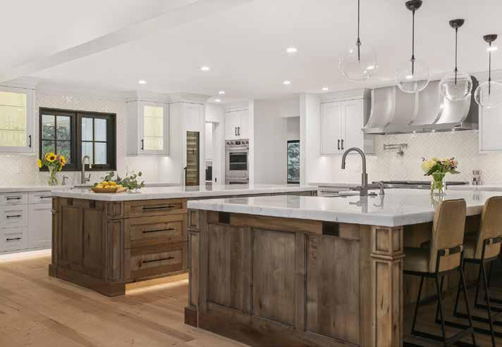 The nearby kitchen continues this bright, natural motif. The two distinct kitchen islands and countertops are wrapped with custom stone slab, while two deep farmhouse sinks and expansive working space maximize functionality. Both island and dining table seating make it a prime gathering space lit with dainty globe fixtures. The custom stove hood and beautiful cabinets—a blend of warm wood tones and luminous white—fully embrace the home’s modern farmhouse character.