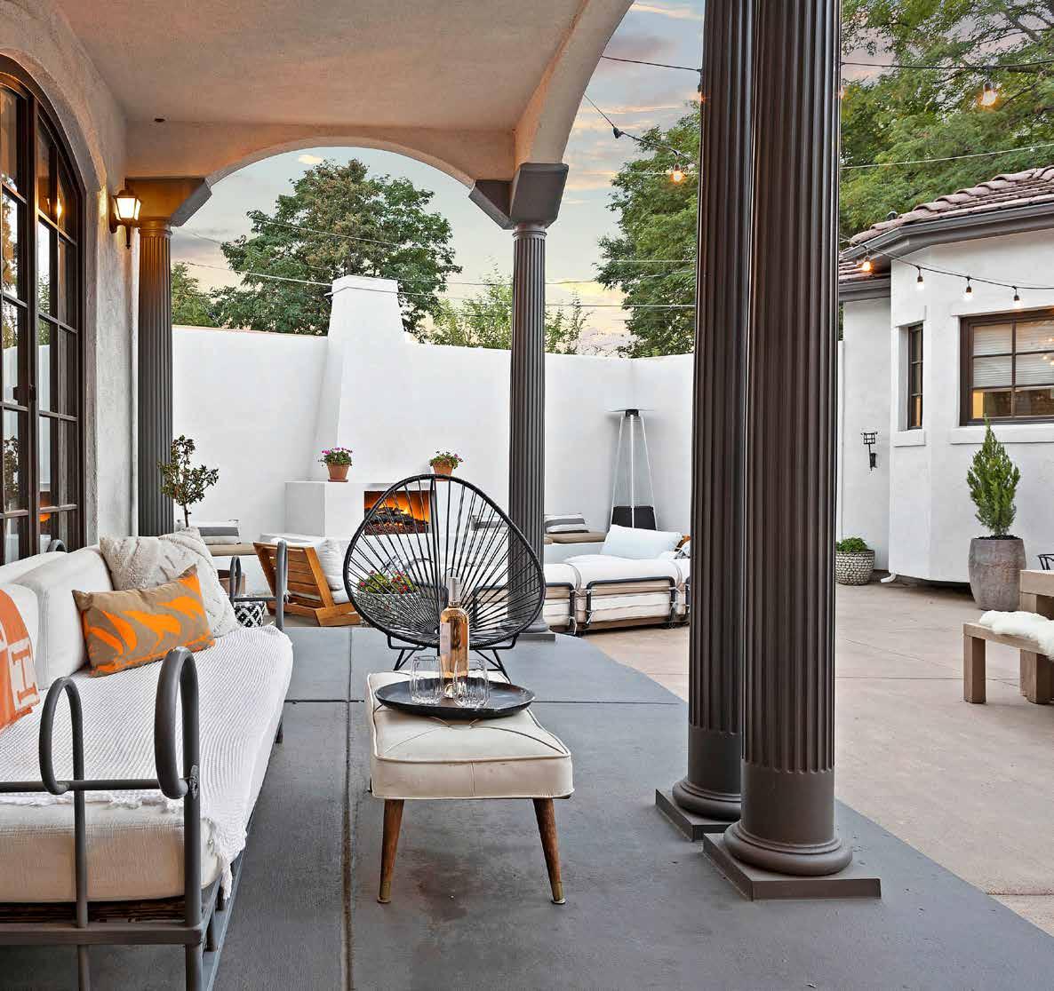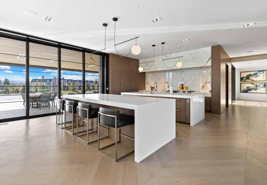 with lofty 28-foot ceilings. Floor-toceiling glass windows and doors lead to the outdoor living space—a multipurpose patio and lawn ideal for day-to-day or for entertaining—while also inviting sunlight and lush backyard views to spill into the space. This abundant natural light illuminates the room’s luscious floors and sleek, standout fireplace.