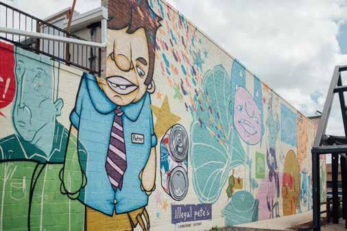 At Illegal Pete's on Colfax, it would almost be more noticeable if there wasn't some street art to admire. Mike Graves, Colorado-based artist and muralist known for his lively characters, and Chris Huth, Colorado-based artist and printmaker, brought Pete's to life with their large mural including some Pabst Blue Ribbon, of course.