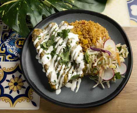 bringing her take on fresh Mexican cuisine to the iconic establishment. There are now eight dishes to choose from with no orange-tinged nacho cheese sauce from a can in sight: enchiladas with red or green chile (or Christmas-style with both); carnitas topped with green chile and served with tortillas on the side; adobo chicken in chipotle sauce; picadillo (ground beef, green chile, and potato stew); calabacitas for the vegetarians (a mélange of roasted vegetables and queso fresco); camarones in adobo sauce; chicken mole with pumpkin and sesame seeds; or a taco salad in a crispy tortilla shell. All but the taco salad come with a fresh side salad and savory rice and beans. Of course, the famous unlimited sopaipillas drizzled with honey are still included with your meal (as well as several a la carte desserts to choose from) and you still raise the flag at your table to signal your server when you’re ready.