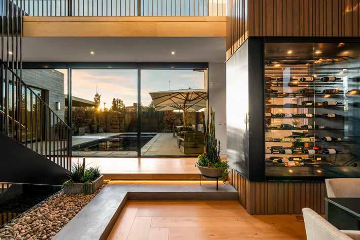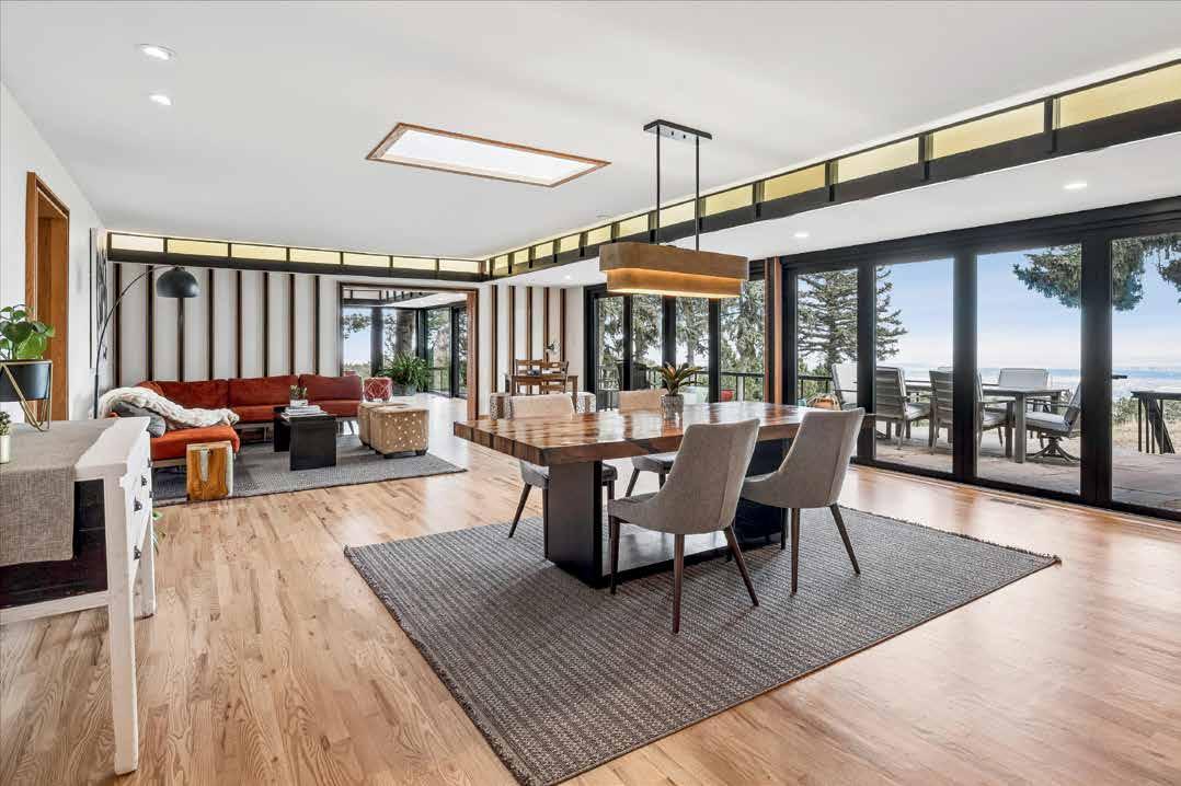Inside, a full wall of sliding glass doors defines the main level, dissolving the boundary between indoors and out. When open, the kitchen, dining, and living areas extend directly into a backyard outfitted with a private pool and hot tub, two separate sitting areas with fireplaces, and an outdoor kitchen.