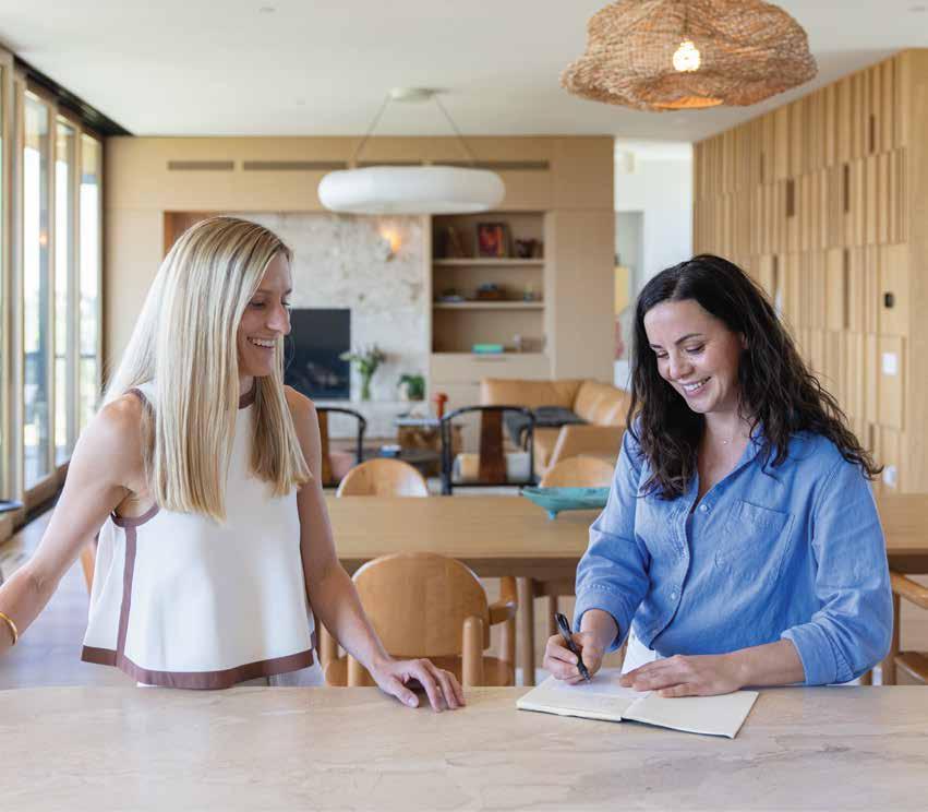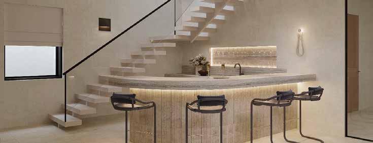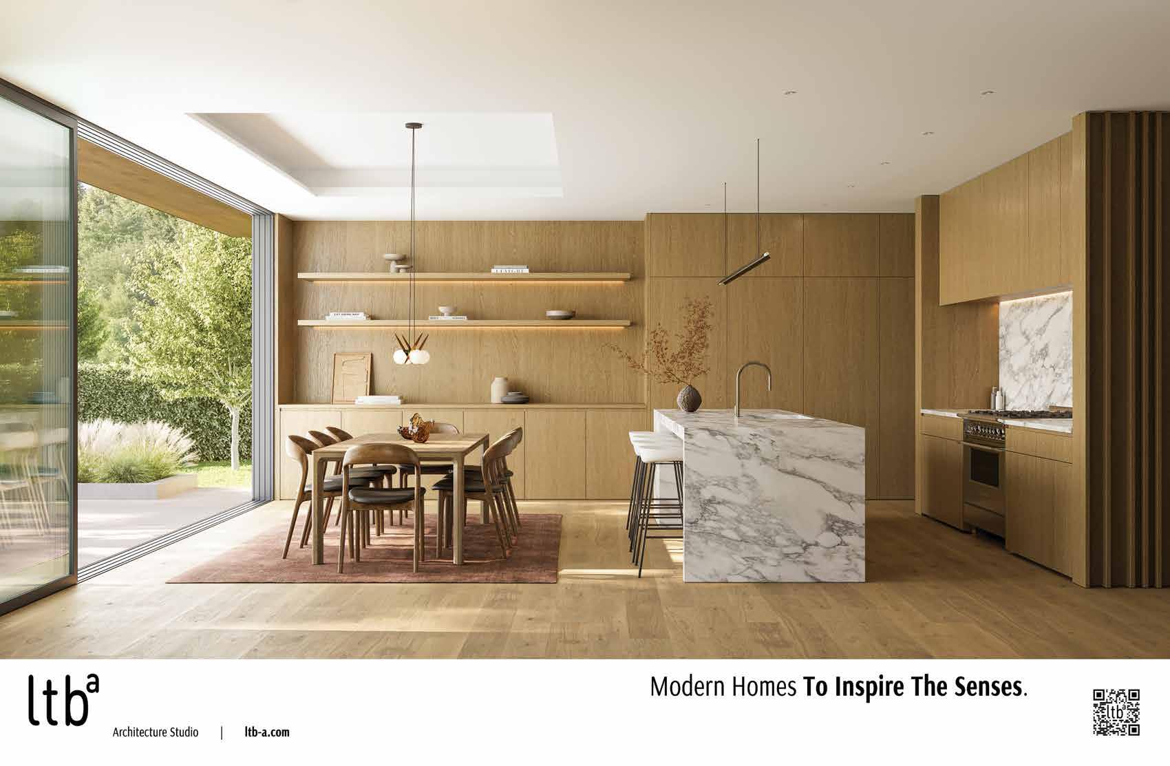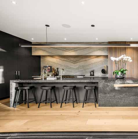 At the center of it all is the chef’s kitchen. Outfitted with Wolf appliances, a Caesarstone waterfall island with live-edge slab detailing, an oversized pantry, wet bar, and integrated coffee nook, it’s designed for performance without sacrificing warmth. “During large-scale entertaining, everything functions effortlessly,” Behr explains. “For everyday living, the kitchen remains warm and approachable.”