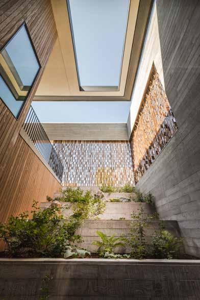 Upstairs, the primary suite occupies its own secluded wing. Sliding pocket doors allow the space to open fully or close off entirely. “The primary suite creates a sense of retreat rarely found in urban homes,” Behr says. A spa-inspired bathroom with radiant heated floors, a steam shower, and an expansive custom closet with its own laundry “elevates daily routines into restorative rituals.”